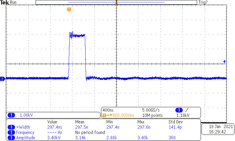 峰值电压:+3kV,电压峰值可调上升沿/下降沿:< 100 ns重复频率:单次 – 1 MHz每序列串总数: 1-10 个可调脉冲宽度: 100 ns ~ 1us,可调触发方式:内部触发、外部触发